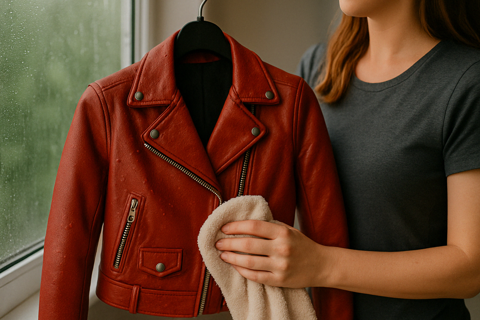 - Osuszanie po czyszczeniu: Po przetarciu kurtki zawsze wycieraj ją do sucha miękką ściereczką. Nie zostawiaj mokrych smug do samoczynnego wyschnięcia, bo mogą pojawić się zacieki lub odbarwienia. Nigdy nie susz jednak skóry suszarką, na kaloryferze ani w pełnym słońcu! (Więcej o suszeniu w dalszej części). Po prostu zbierz nadmiar wody szmatką i powieś kurtkę w przewiewnym miejscu, by wyschła naturalnie.